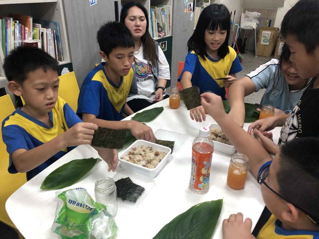 而到了孝親日當天,特別邀請食農課的獵人包老師安排了食農體驗,讓家長們可以體驗孩子平常所學習的課程。先由孩子們帶著家人一起調配果汁,將胡蘿蔔汁、蘋果汁、鳳梨汁一一測量比例,再加氣泡水,最後全部倒入瓶子中,孩子們使勁地搖,搖累了換家人一起搖,使其均勻地混合,最後一杯新鮮好喝的綜合蔬果汁就調好了。接著,繼續製作飯糰,將包老師事先準備好的飯拿起搓揉,再拿一片海苔包裹在飯的外面,一捲一捲的飯糰也完成了!