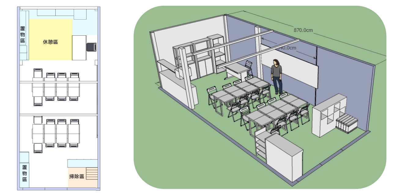 我們將教室的格局與各桌椅尺寸提供給軟裝設計師雅葶,
