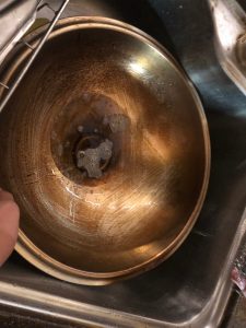 最後阿蟲請大家到水槽看看剛剛做煙燻料理的器具發生了什麼事情,這時候大家才注意到,不只是食材被上色,連鍋蓋、鐵架、炒鍋也是,尤其是鐵架跟炒鍋,還有焦炭、雞油附著在上面。